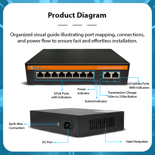 Secuview 120W 8-Port PoE Switch + 2 Uplink Ports | 10/100Mbps Operation.