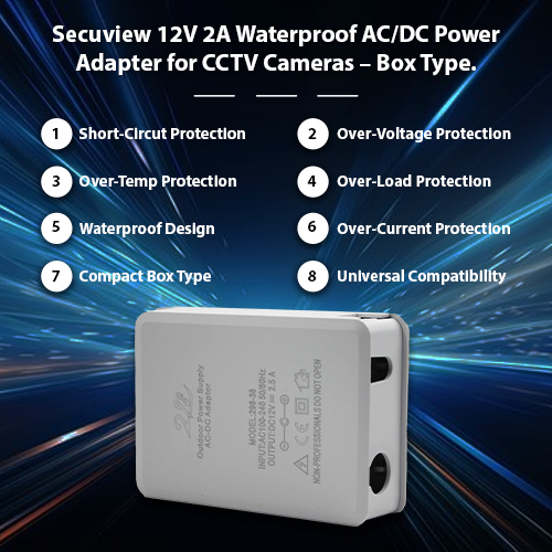 Secuview 12V 2A Waterproof Power Adapter delivers stable, safe power for CCTV cameras. Durable box design for indoor and outdoor use.