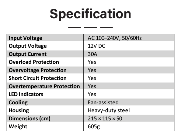 Switching Power Supply: Advanced switching technology converts AC to DC efficiently with minimal energy loss, providing a steady 12V DC output for high-demand electronic devices.