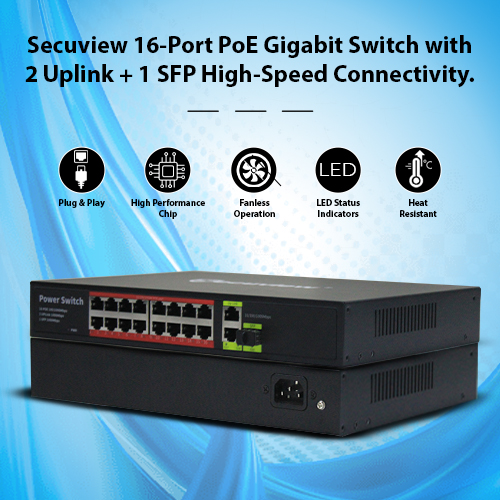 Secuview 16-Port PoE Gigabit Switch with 2 Uplink + 1 SFP High-Speed Connectivity.