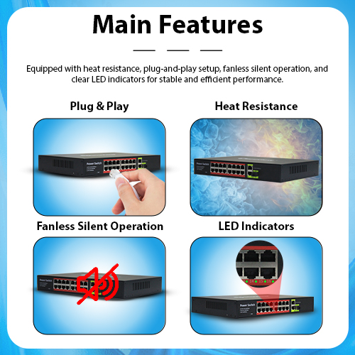 Main Features: Equipped with heat resistance, plug-and-play setup, fanless silent operation, and clear LED indicators for stable and efficient performance.