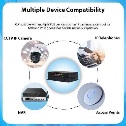 Multiple Device Compatibility: Compatible with multiple PoE devices such as IP cameras, access points, NVR and VolP phones for flexible network expansion.