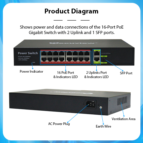 Product Diagram: Shows power and data connections of the 16-Port PoE Gigabit Switch with 2 Uplink and 1 SFP ports.