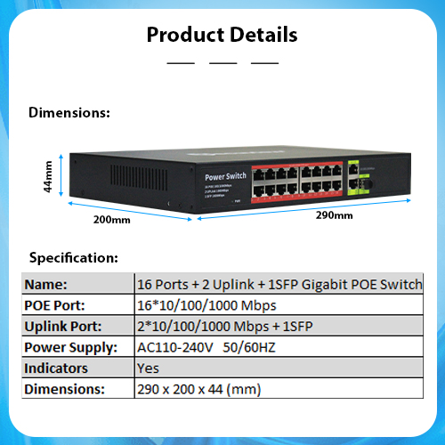 Name: 16 Ports + 2 Uplink + 1SFP Gigabit POE Switch