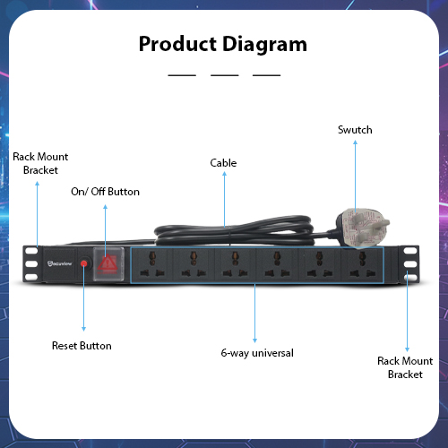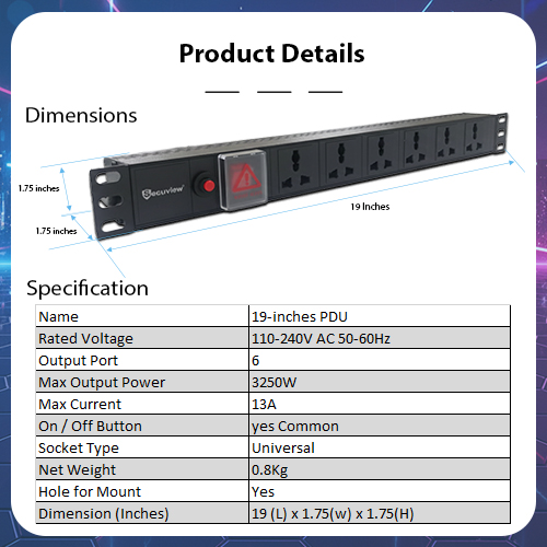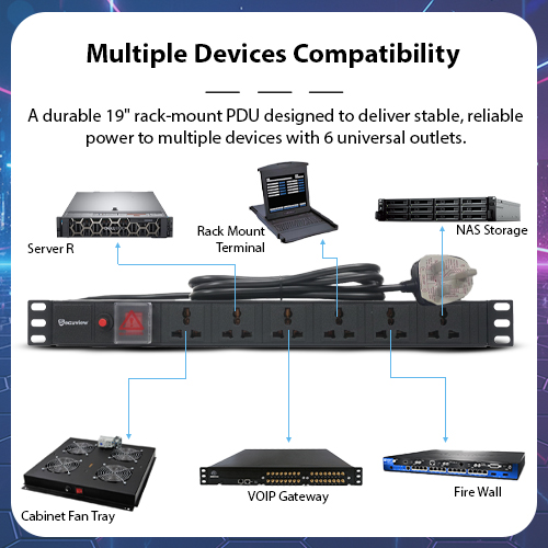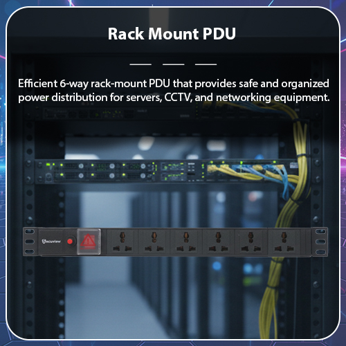 Rack Mount PDU: Efficient 6-way rack-mount PDU that provides safe and organized power distribution for servers, CCTV, and networking equipment.