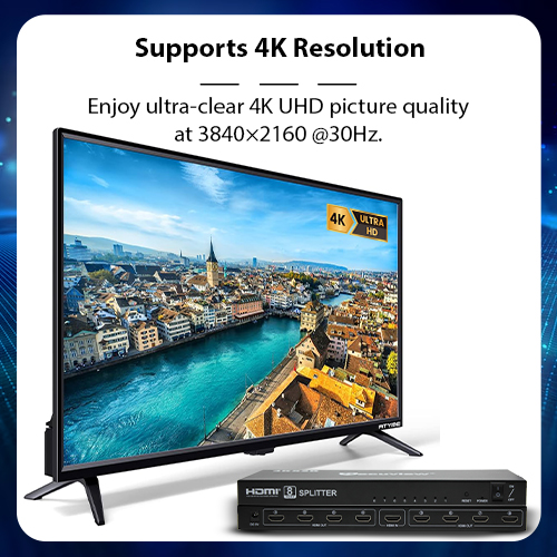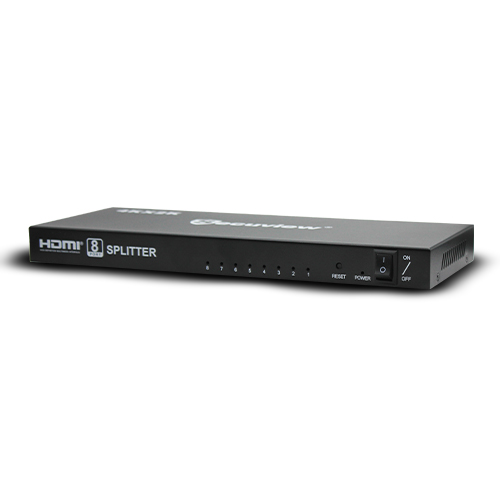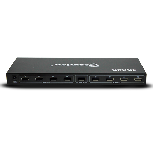 The Secuview 1×8 HDMI Splitter connects a single HDMI source to eight displays or projectors. It also regenerates the signal for longer cable runs, supporting resolutions up to 3840×2160 @30Hz.