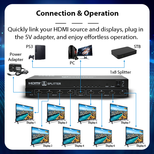Connection & Operation: Quickly link your HDMI source and displays, plug in the 5V adapter, and enjoy effortless operation.