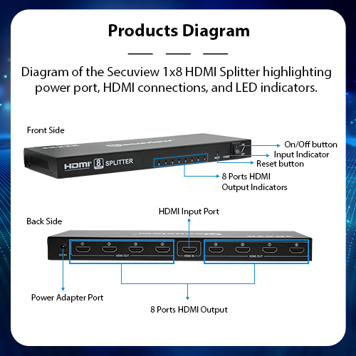 Product Diagram: The Secuview 1×8 HDMI Splitter showcases front-side LED indicators, reset, and power buttons, while the rear side features HDMI ports and the power input.