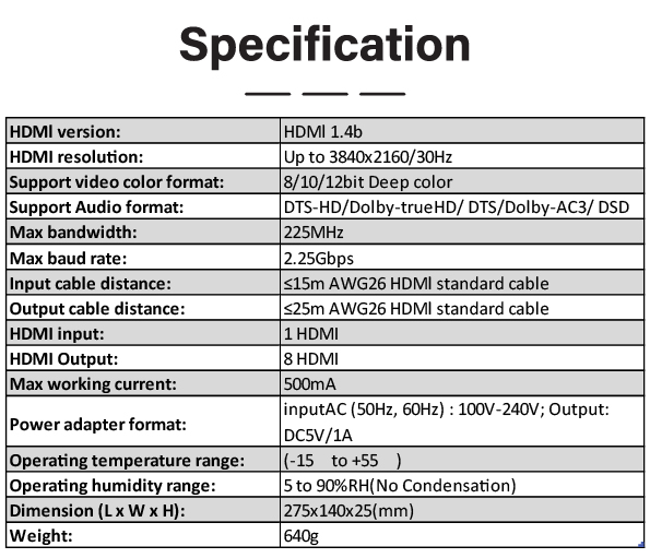 Output cable distance: ≤25m AWG26 HDMI standard cable