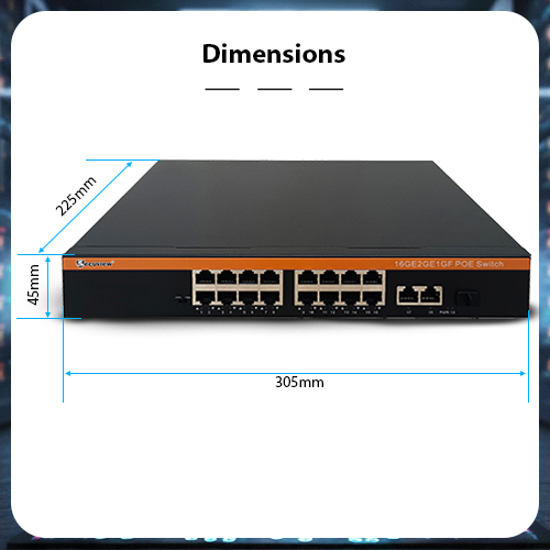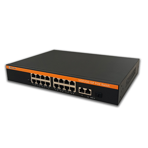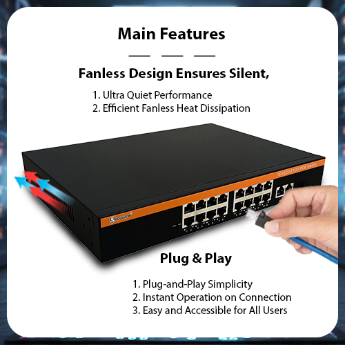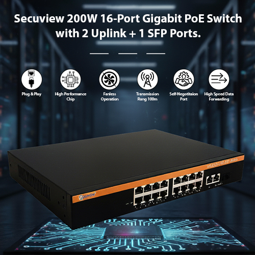 Secuview 200W 16-Port Gigabit PoE Switch with 2 Uplink + 1 SFP Ports.