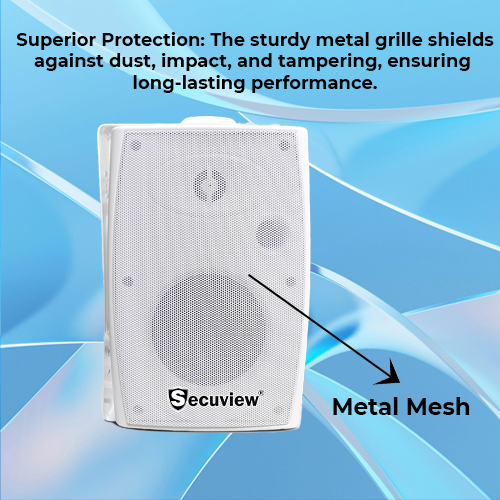 Metal Mesh: This wall-mounted speaker features a strong metal grille for protection and clear sound. Its sleek, perforated design boosts audio and adds a modern touch to any space.