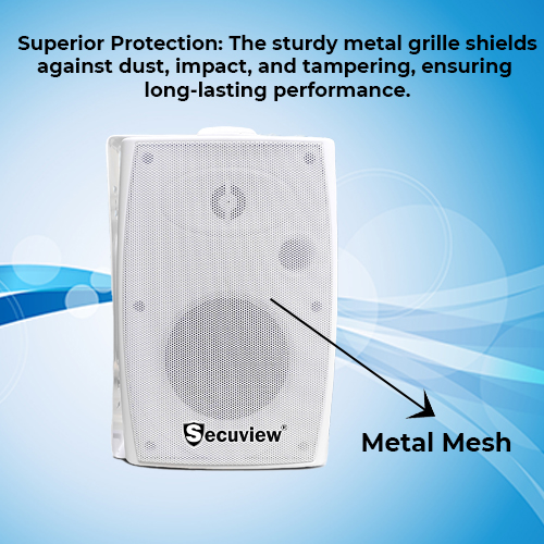 Metal Mesh:This wall-mounted speaker has a sturdy metal grille for protection and clear sound. The sleek, perforated design enhances audio and gives a modern look to any space.