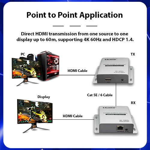 Point to Point Application: Direct HDMI transmission from one source to one display up to 60m, supporting 4K 60Hz and HDCP 1.4.