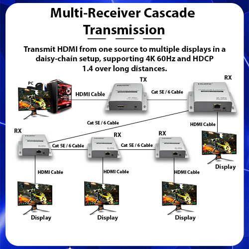 Multi-Receiver Cascade Transmission: Transmit HDMI from one source to multiple displays in a daisy-chain setup, supporting 4K 60Hz and HDCP1.4 over long distances.