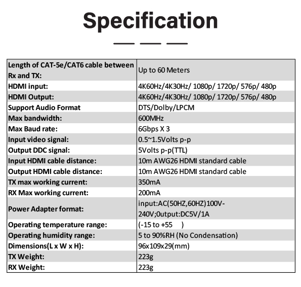 Length of CAT-5e/CAT6 cable between Rx and TX: Up to 60 Meters
