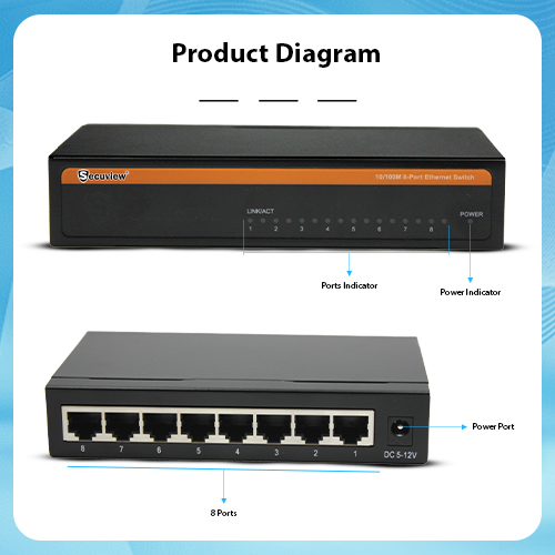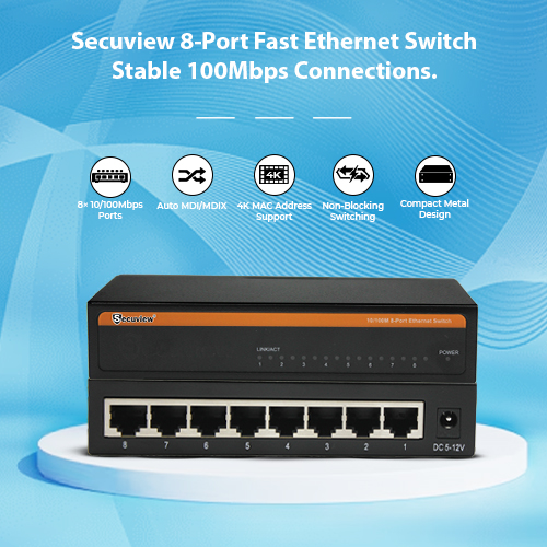 Secuview 8-Port Fast Ethernet Switch delivers stable 100Mbps connections with reliable performance, ideal for home, office, and commercial networks.