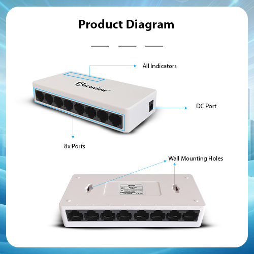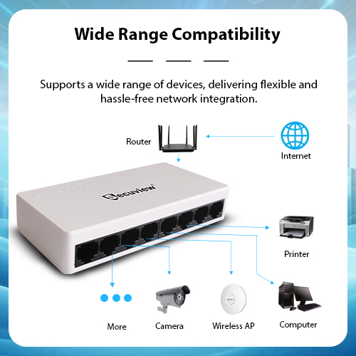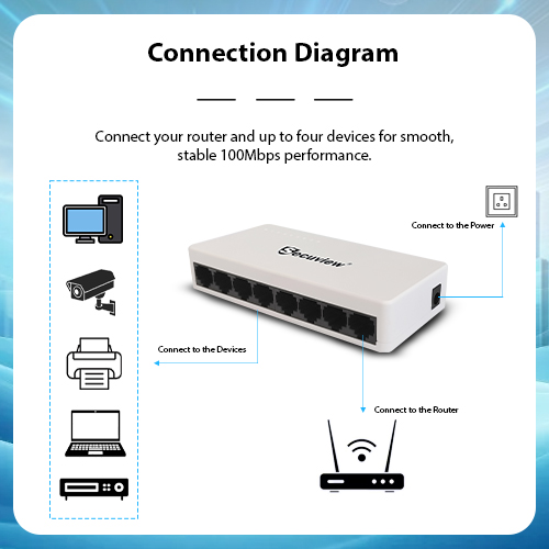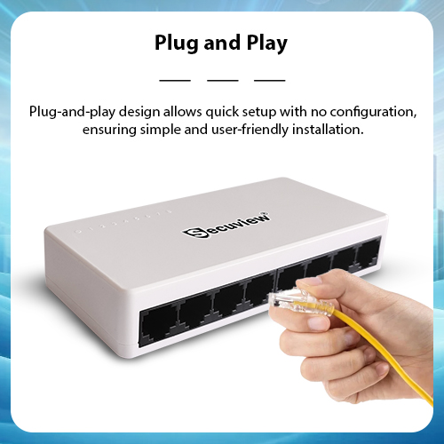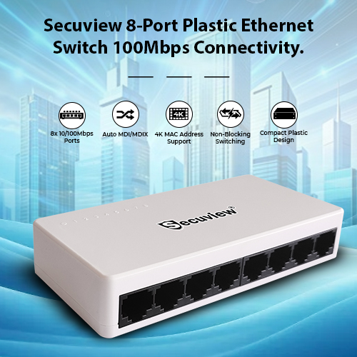 Secuview 8-Port Plastic Ethernet Switch delivers fast and stable 100Mbps connectivity with plug-and-play setup, ideal for home, office, and small networks.