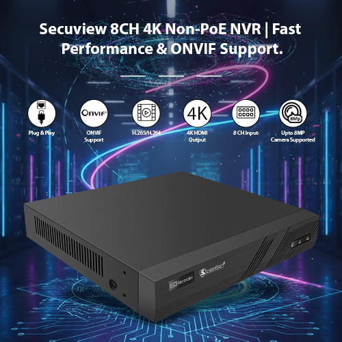 Secuview 8CH 4K Non-PoE NVR delivers ultra-clear recording, fast performance, and ONVIF compatibility for seamless CCTV integration.
