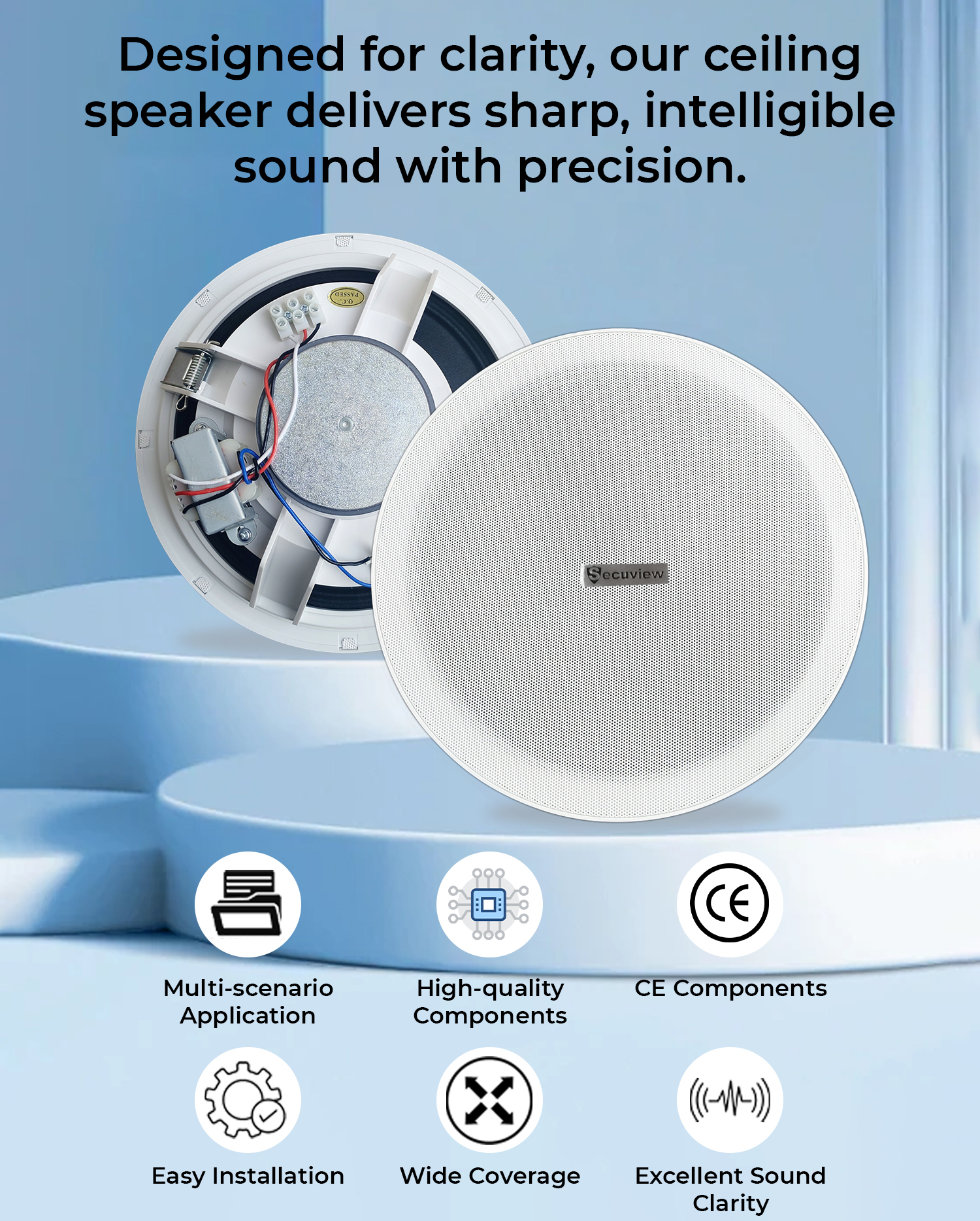 This ceiling speaker is built to deliver clear, intelligible sound—even in large or noisy spaces. Its advanced design ensures announcements, music, and alerts are heard clearly throughout the area.