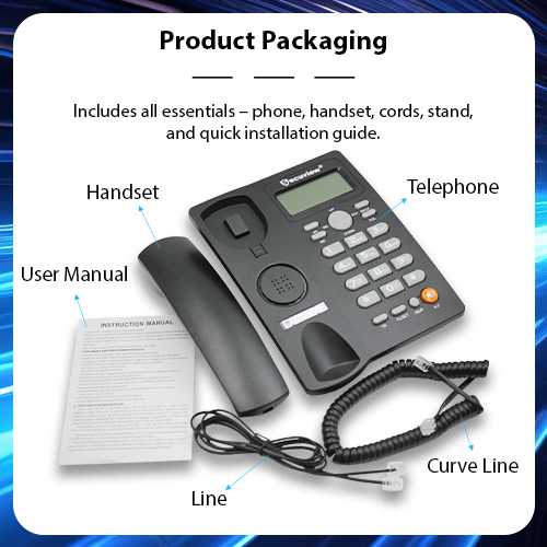 Product Packaging: Includes all essentials – phone, handset, cords, stand, and quick installation guide.