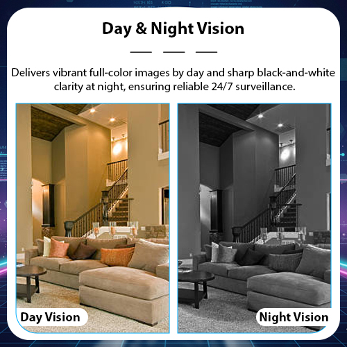 Day & Night Vision: Delivers vibrant full-color images by day and sharp black-and-white clarity at night, ensuring reliable 24/7 surveillance.