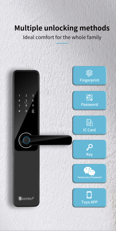 Multiple unlocking methods: Fingerprints, password, RF card, mechanical key, Tuya app, and temporary password.