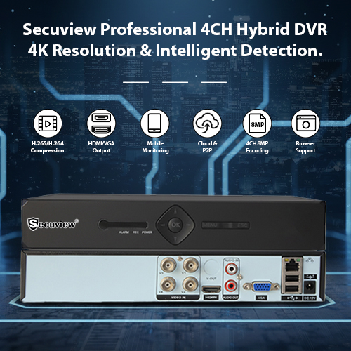 Secuview Professional 4CH Hybrid DVR | 4K Resolution & Intelligent Detection.