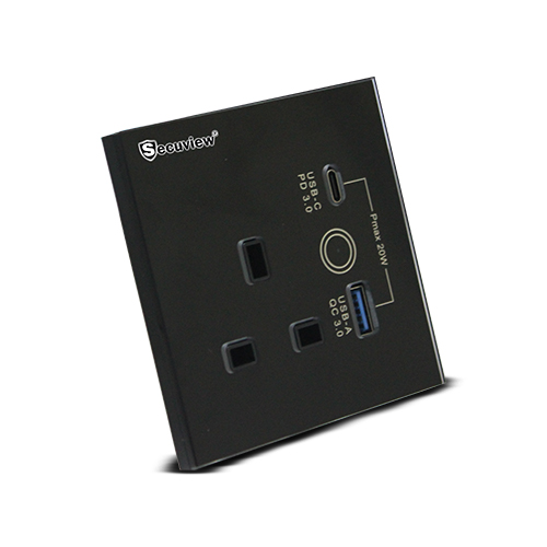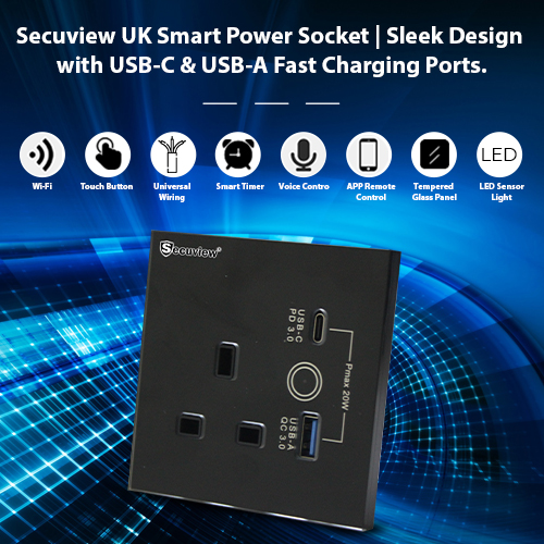 Effortlessly power your devices with the sleek Secuview UK Smart Power Socket, featuring fast USB-C and USB-A ports.
