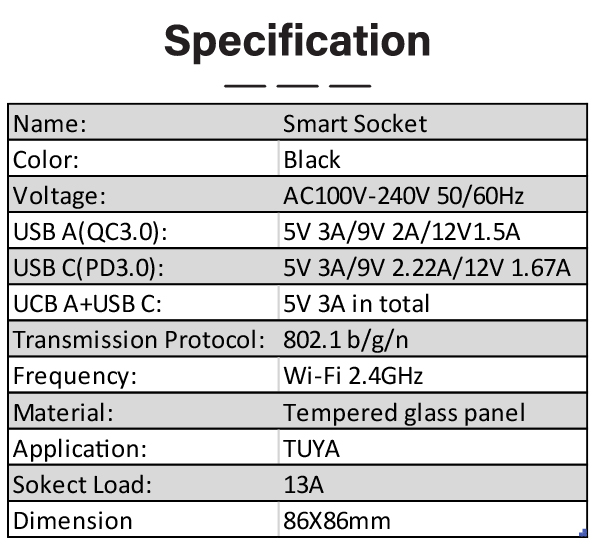 USB A(QC3.0): 5V 3A/9V 2A/12V1.5A