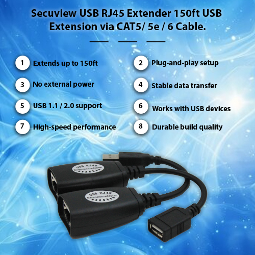The Secuview USB RJ45 Adapter extends USB connections up to 150ft (45m) over CAT5/5e/6 cables. Ideal for cameras, printers, webcams, and other USB devices with stable, power-free performance.