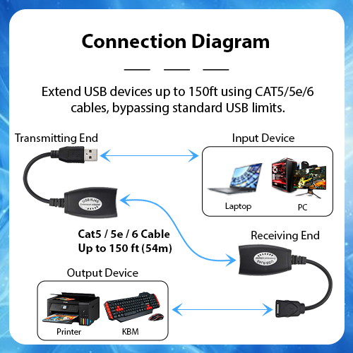 Connection Diagram: Extend USB devices up to 150ft using CAT5/5e/6 cables, bypassing standard USB limits.