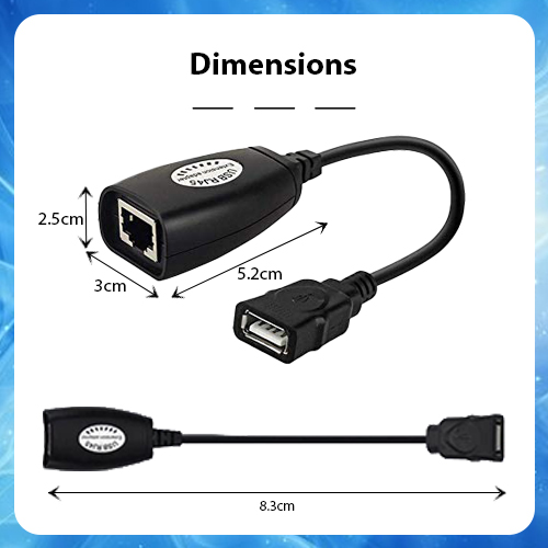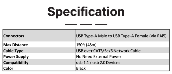 Connectors: USB Type-A Male to USB Type-A Female (via RJ45)
