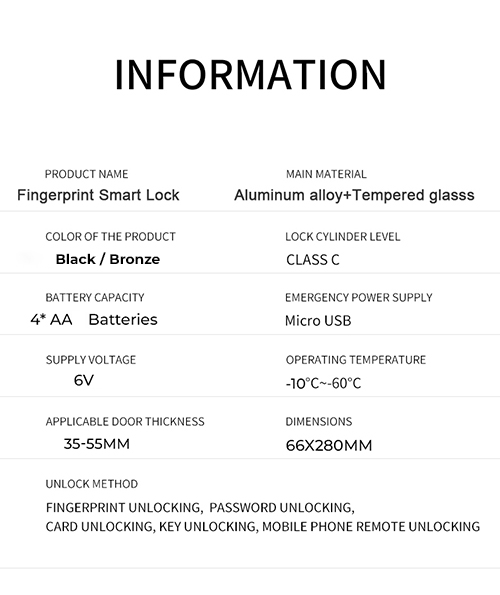Unlocking methods: Password, fingerprint, RF card, key and mobile App, including temporary password.