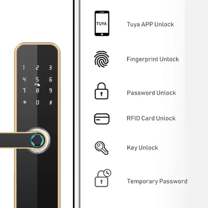 Multiple unlocking methods are available: Fingerprints, passwords, RF cards, mechanical keys, and the Tuya app, including temporary passwords.